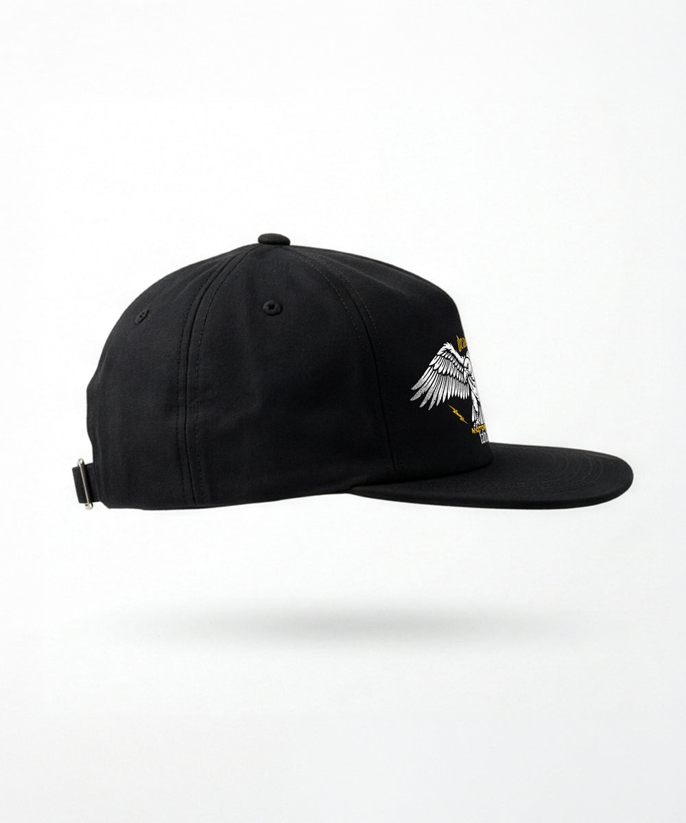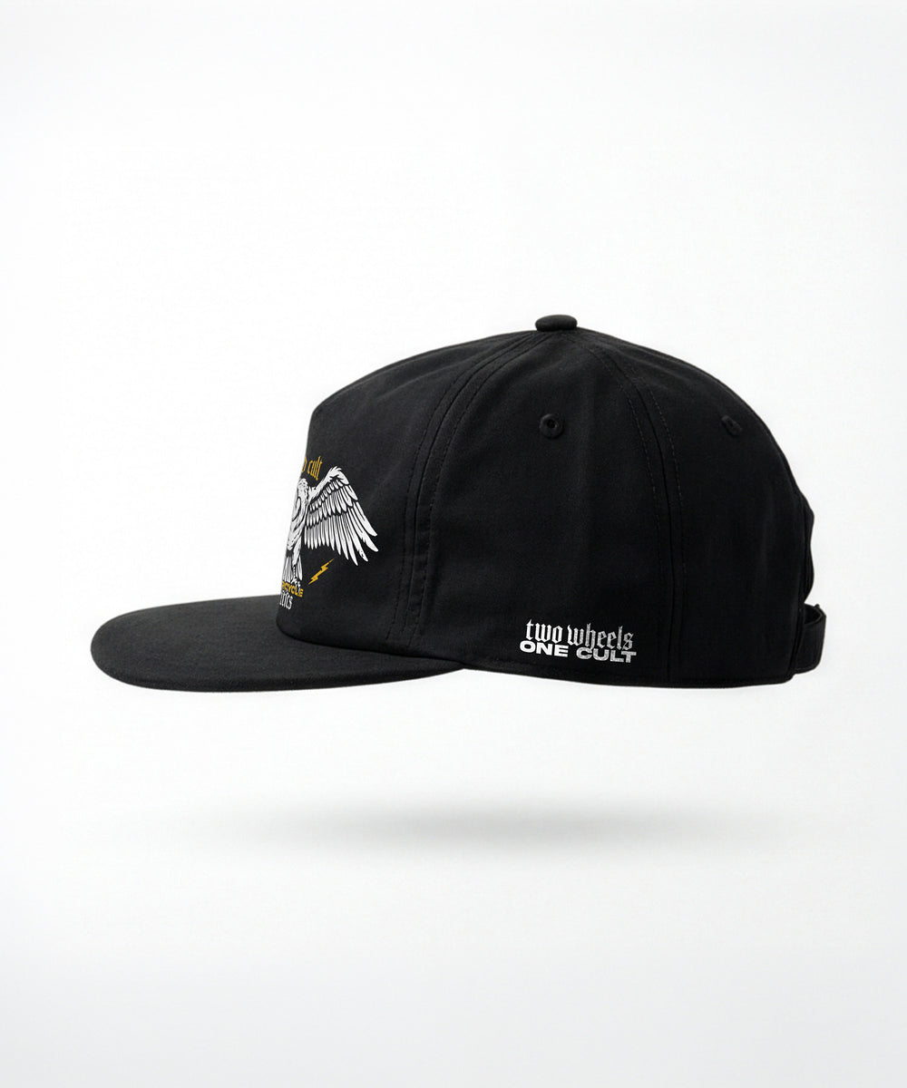 Die VULTURE Cap bringt den Look direkt nach vorne. Der Geier sitzt zentral, breit, nicht zu übersehen. Kein Symbol zum Deuten, sondern einfach da. Seitlich „TWO WHEELS. ONE CULT.“ als Detail, das bleibt.